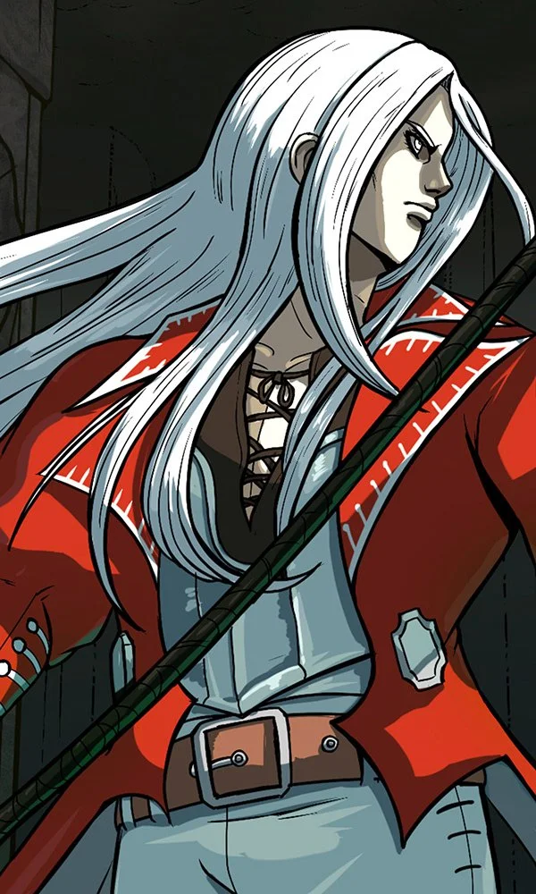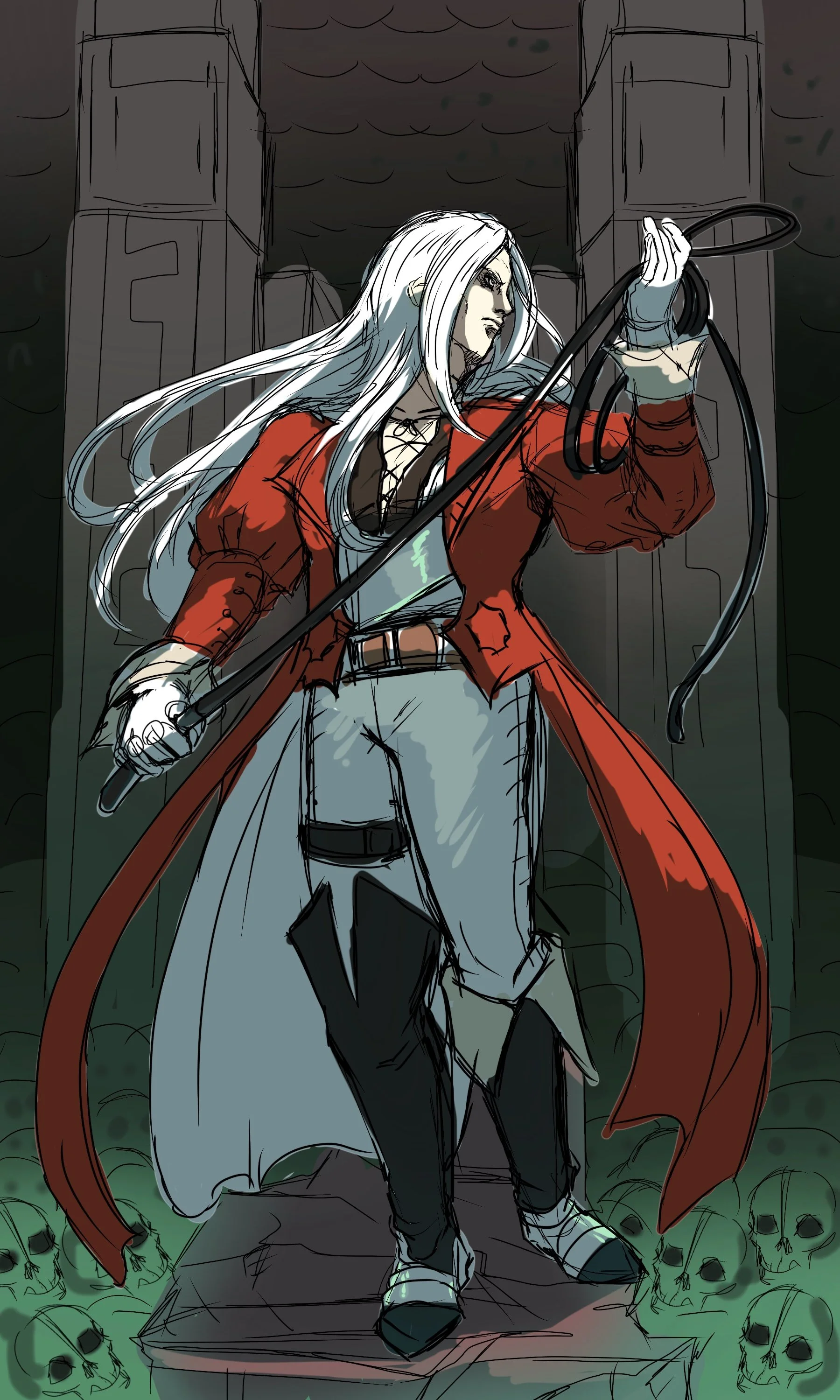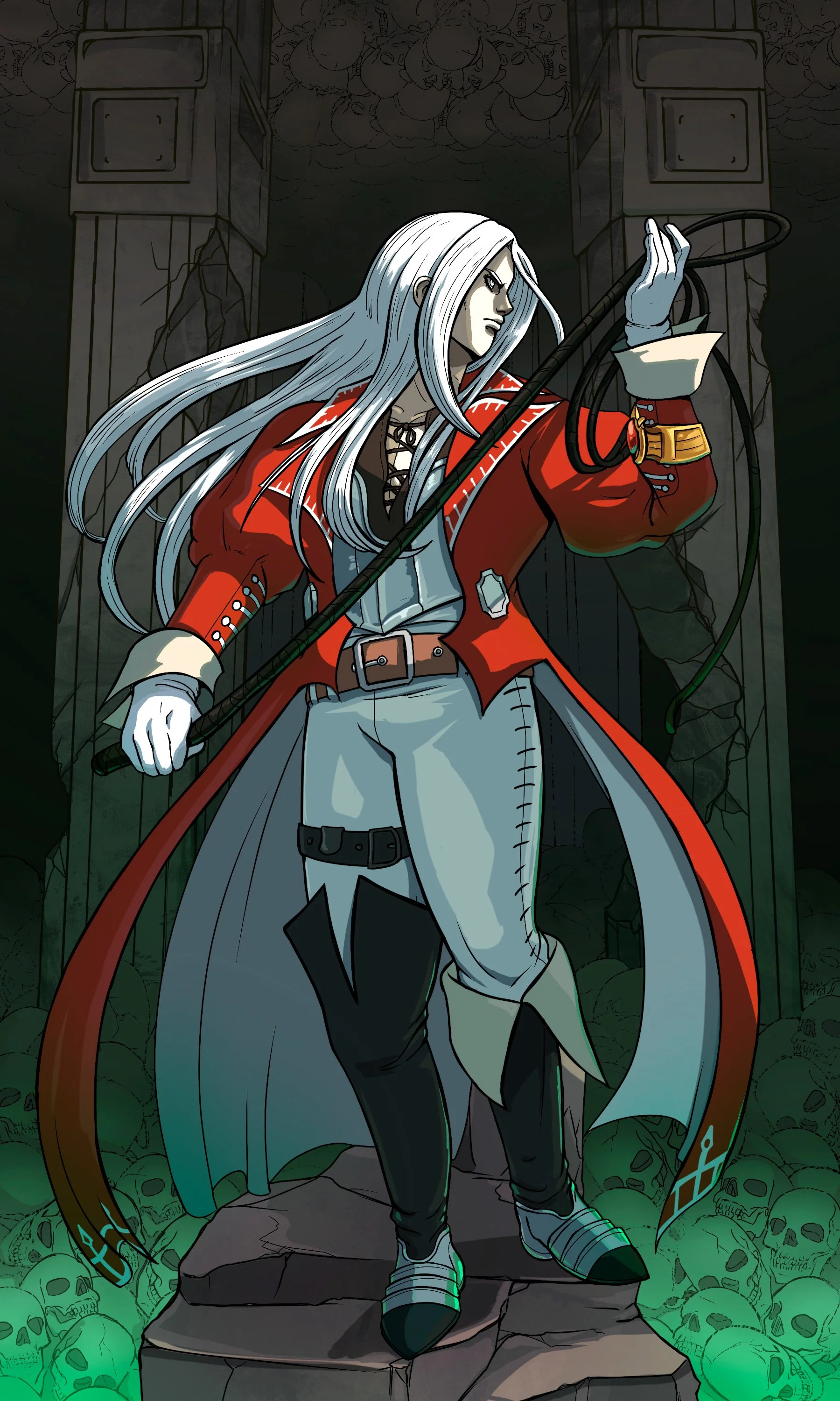 Richter Belmont is arguably the most popular protagonist in the Castlevania series. The design for him chosen was his appearance in the game Castlevania: Rondo of Blood. The Background was lifted from a segment in the game with a burning city.