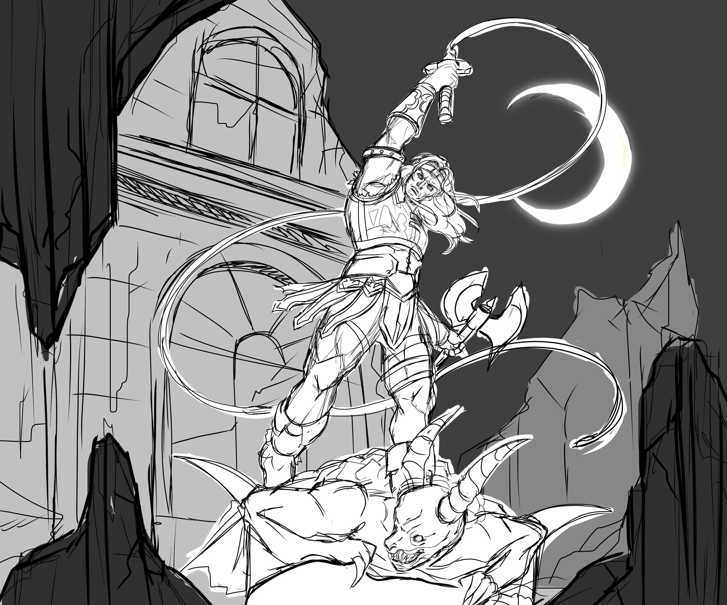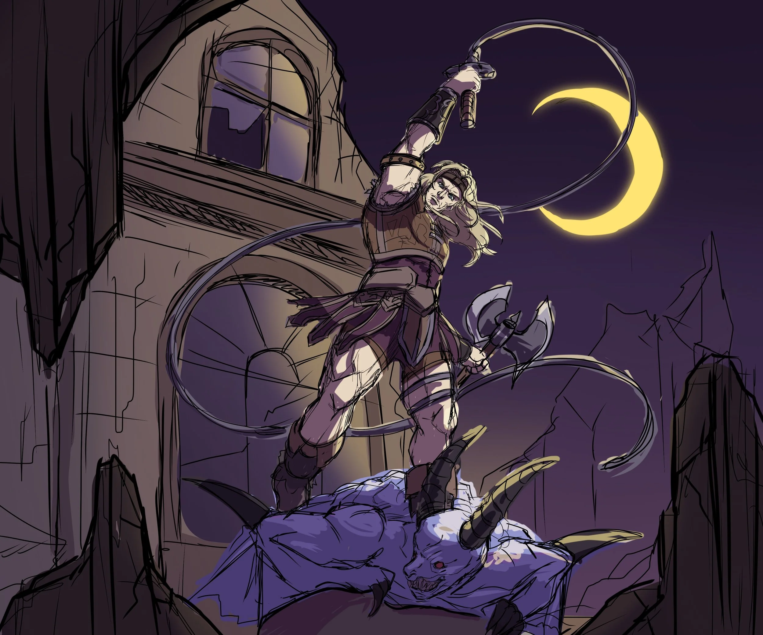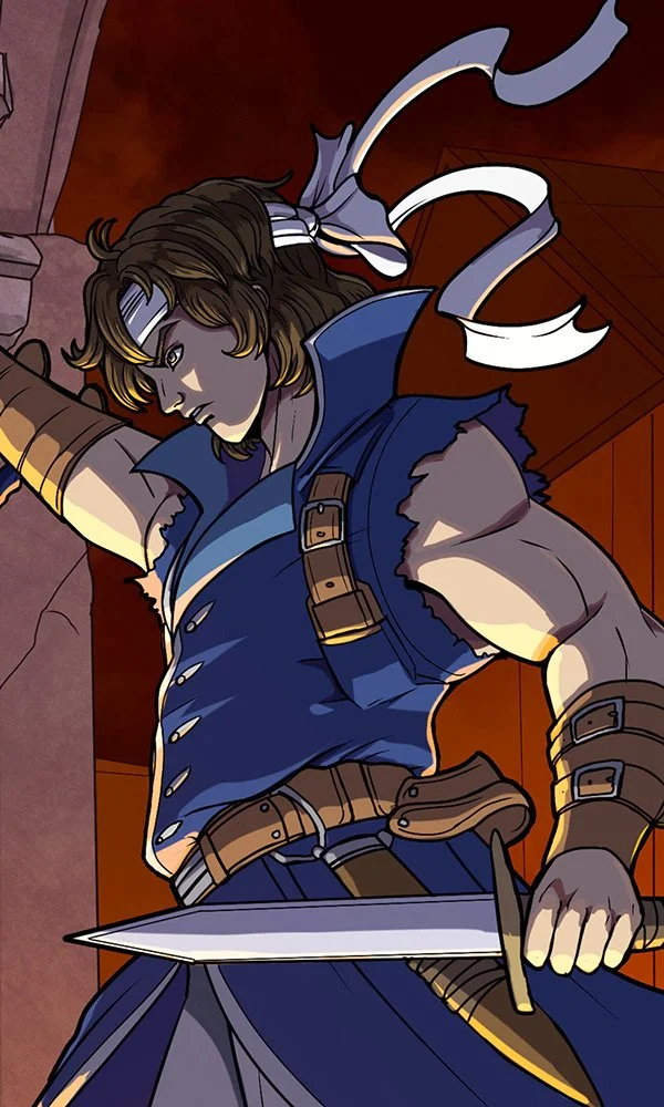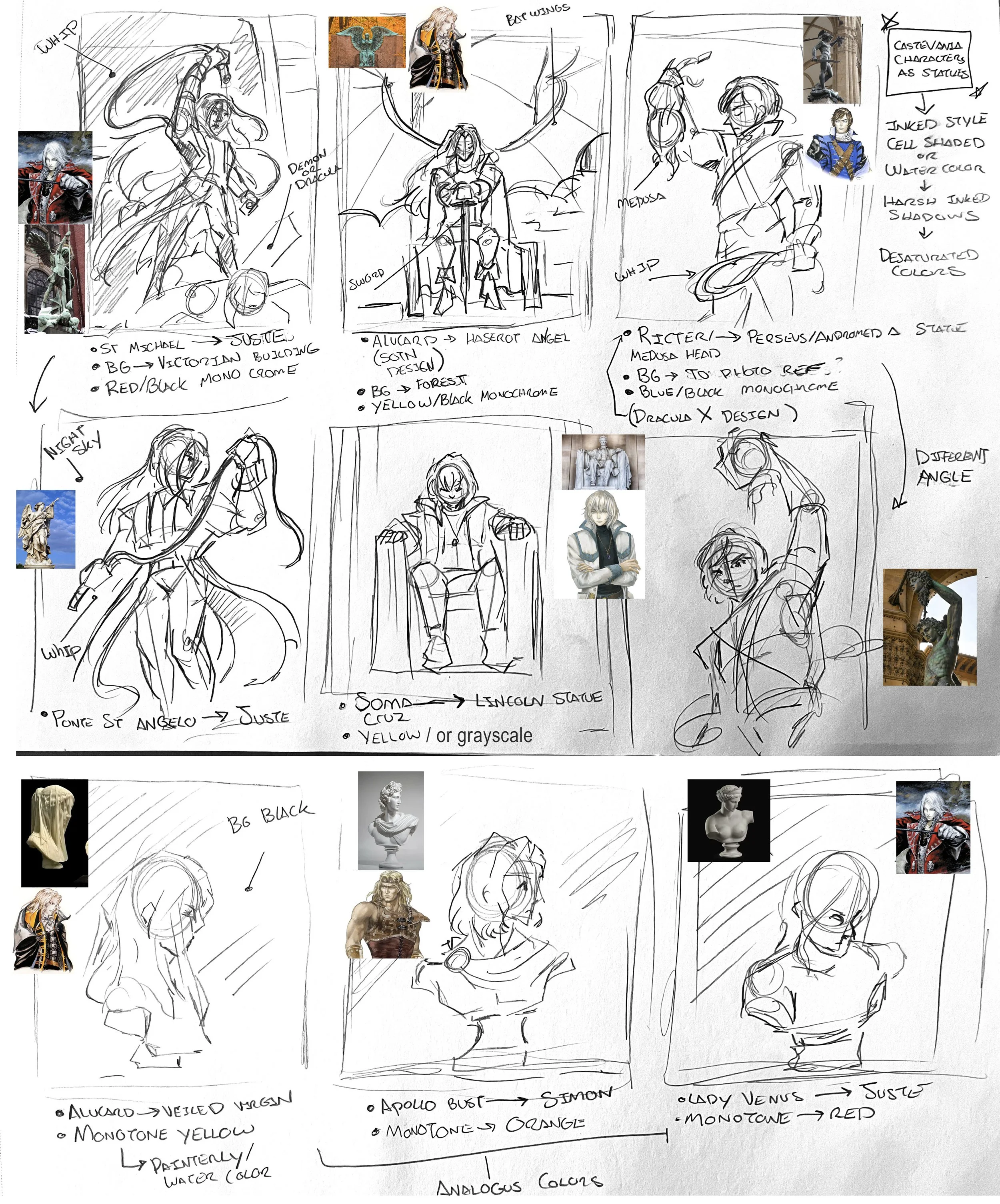 Below is a project depicting three of the Castlevania protagonists in the poses of famous statues. These were done as a collective series and are meant to be displayed as a group. The locations are referenced from each corresponding game the hero is a part of, and each location and hero was chosen to create a triadic color scheme across all three illustrations.
