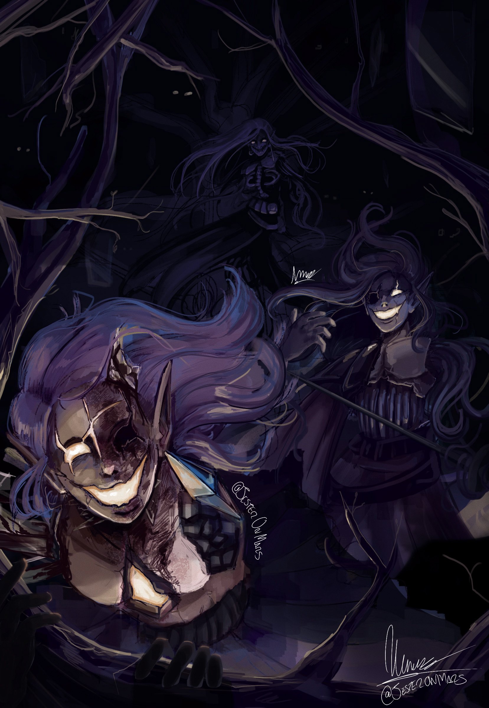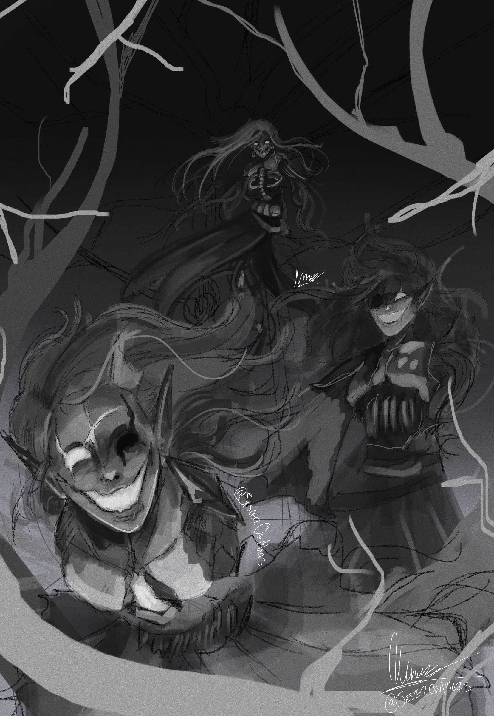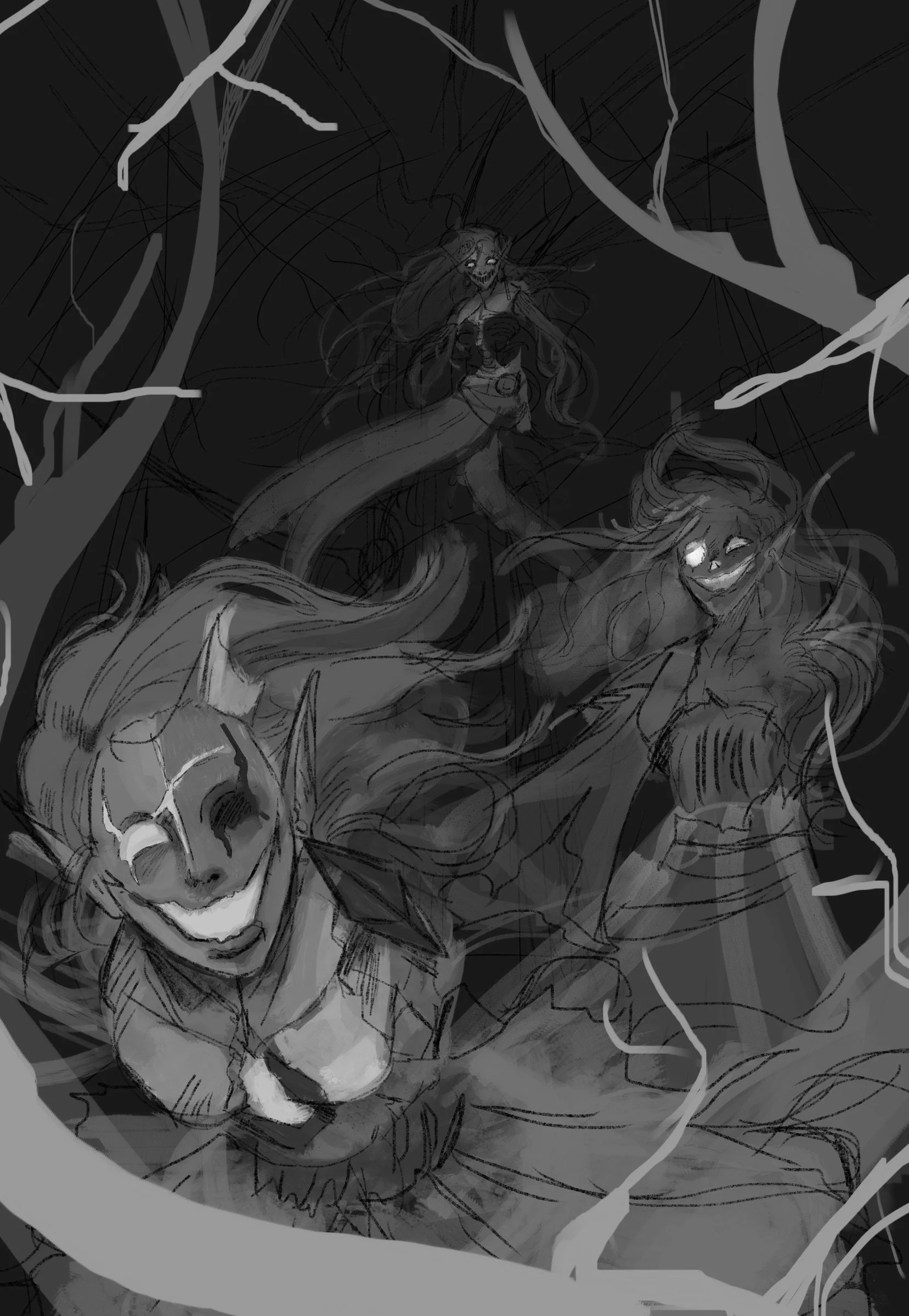 Below is concept art of the Triplets of Chaos from my webcomic series "METAMORPHOSIS: We as Mortals." The three characters are wraiths born from one vengeful soul who has taken the bodies of elves who had wandered too close to purgatory.