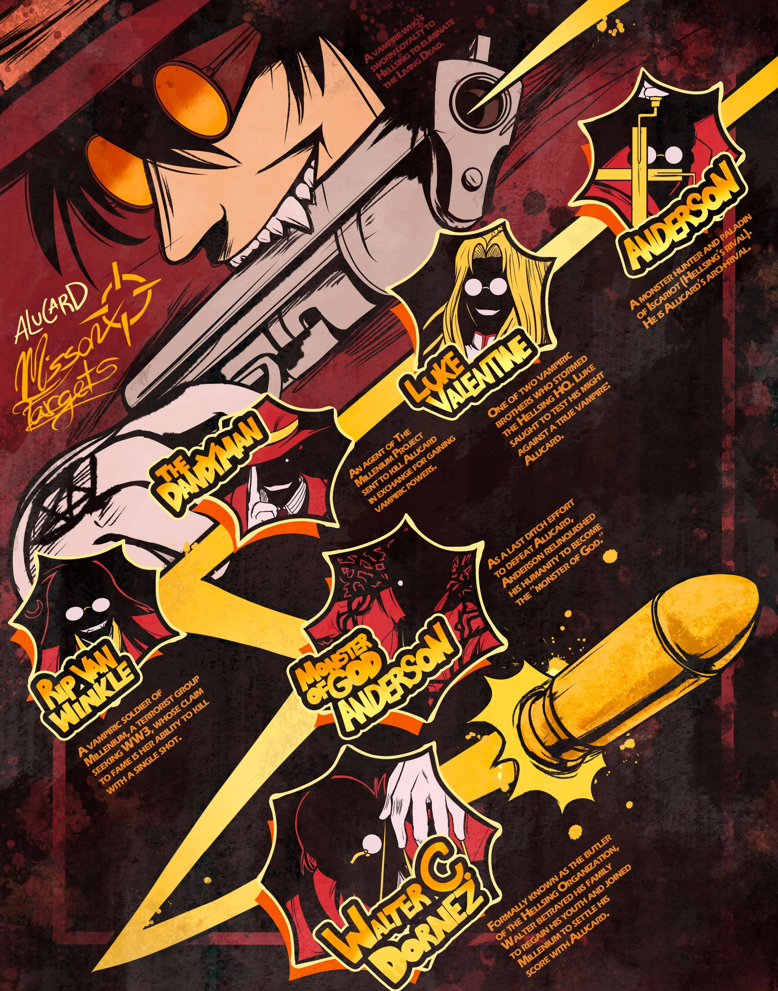 For this project, I was to create an 11x14-inch infographic portrait. The chosen character was Alucard from the series Hellsing. The information displayed is a timeline of the villains being defeated by the main character: Alucard.