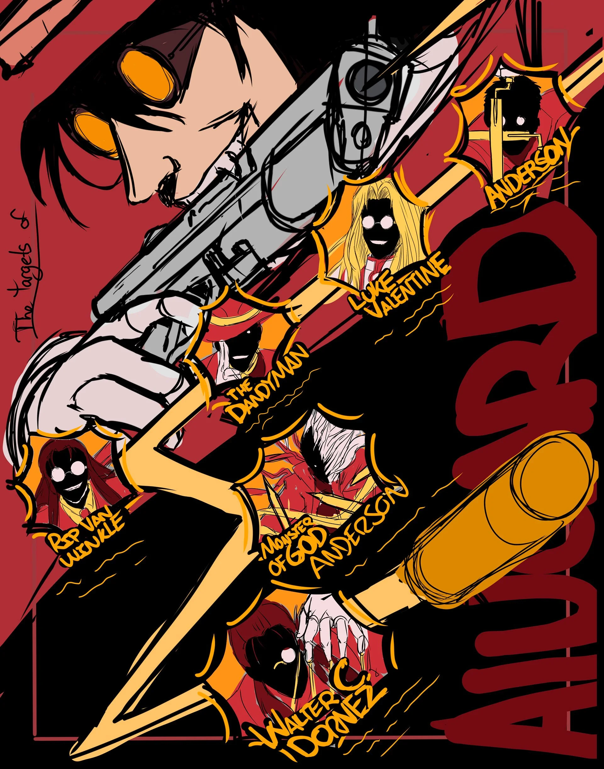 For my illustration, I wanted to create something with high energy as a challenge and also to try and create something visually appealing. I knew immediately that I wanted the action line of a gun firing to be a timeline, and I went through a few ideas before landing at the final piece. Hellsing had two anime adaptations (the most recent one being the most popular), however the original anime had a very interesting jazz soundtrack. It was a blend of rock and jazz with a gothic undertone to it. And while most fans prefer Hellsing Ultimate (the later adaption), the soundtrack of the original Hellsing series was the fan favorite—especially the opening theme: “A World without Logos.” So, I wanted to base the overall style and color scheme on Jazz Posters. Red is Alucard’s color, so I found some great references to construct my infographic!